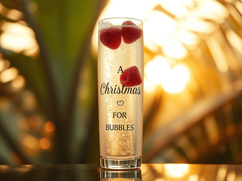 This evening’s bubbly is in my favourite glass – a tall one from friend Tara one Christmas. It has “A ? Christmas for Bubbles” written on it – one of the words scratched off. Four plump raspberries bob around the surface, tiny bubbles rise constantly up the glass. The glass is wet with condensation. Birds twitter as usual and my incense stick’s smell is deeply satisfying, evoking memories of holidays. It’s a very balmy evening, nearly 7.30pm and still daylight, the sun a big round ball hovering. I have to look past banana tree fronds to see it. I’m hot, my face sweaty, even though I dipped in the icy pool not long ago.