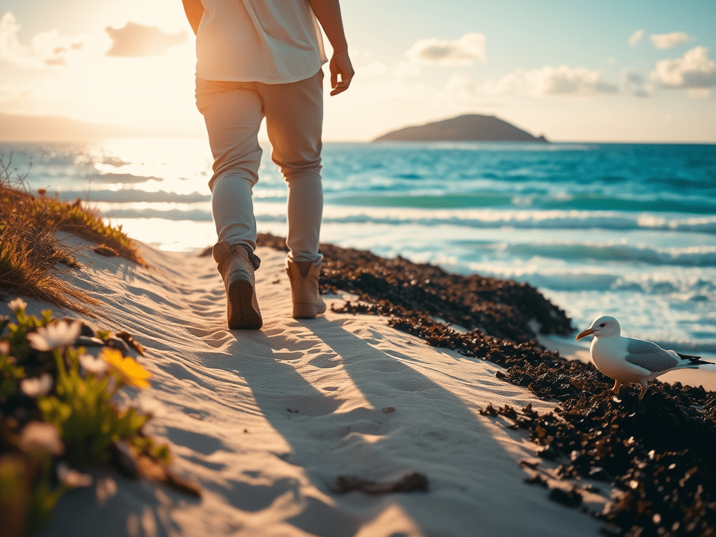 Through my sunglasses the sea to our right now appeared bluer-than-blue, the sky dotted with pink-tinged clouds. The rhythm of our footsteps and the gentle breeze started to lull me into a kind of calmness after my earlier hysteria.