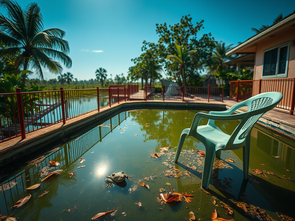 The resort was old and dated, the pool definitely not for swimming in. Paint was peeling off the rusty fence and a lone plastic chair was the only poolside furniture, tipping forward at an angle, suggesting a broken leg.