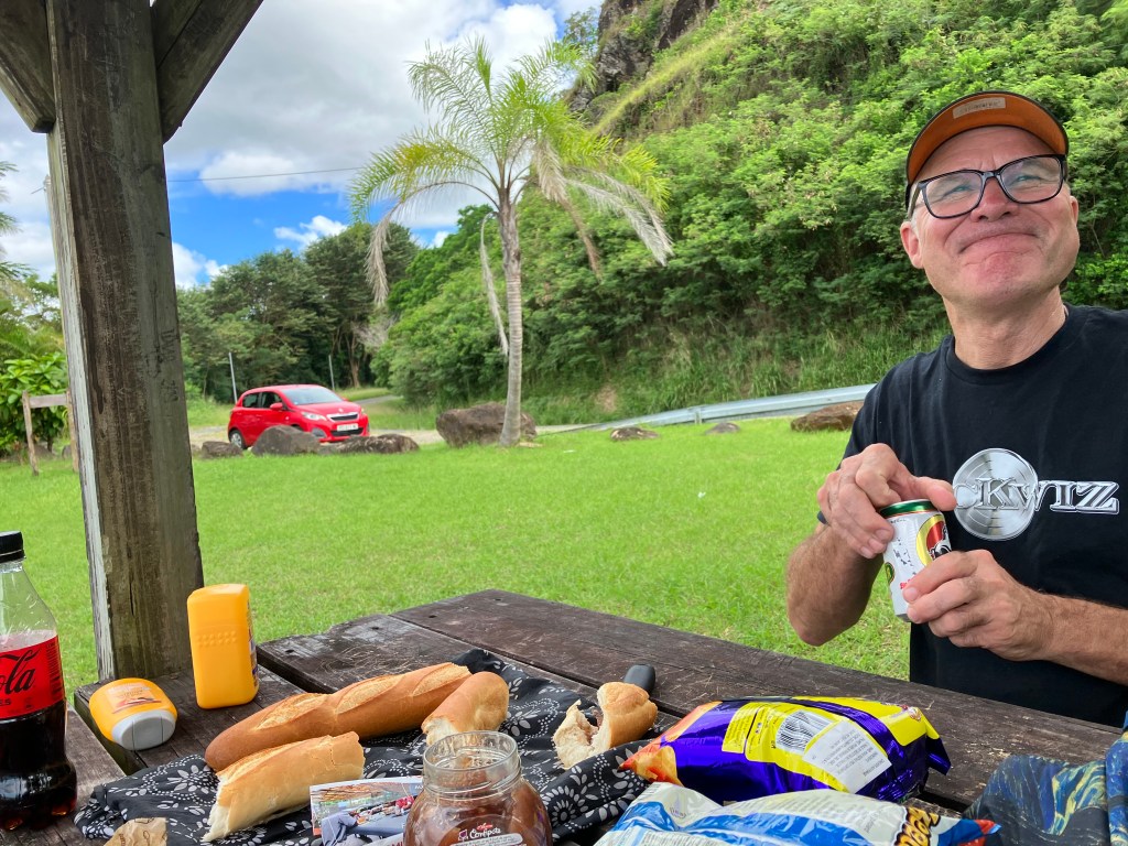 We stopped at some picnic tables on a grassy lookout point and had a lunch of baguette, salami, cheese and chips, washed down by a beer. (Earlier that day we had stocked up on these items at a supermarket in Bourail.)