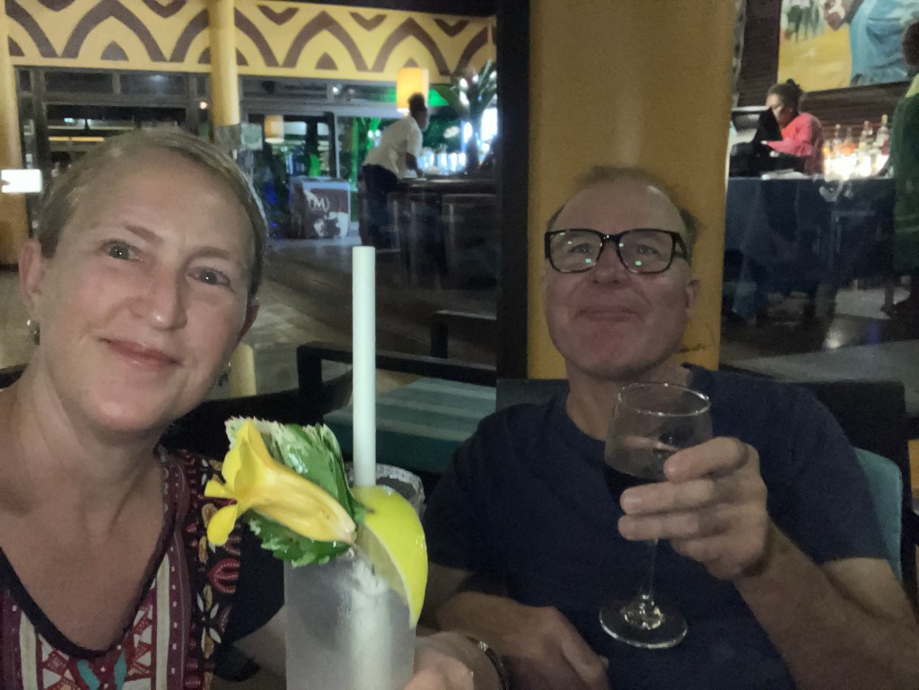 We sat by the pool on loungers and checked out the menu. Thankfully, no buffet, but still expensive. At least $40 for a main course. But again, not many options so I reserved us a spot. Afters naps and a shower, we mozzeyed on to the bar for a pre-dinner drink. I had a gin fizz and Matt had a red wine. We sat up at the bar and talked a while to the lady serving. Matt ordered a steak which he loved. I had tuna – also good but his steak won.