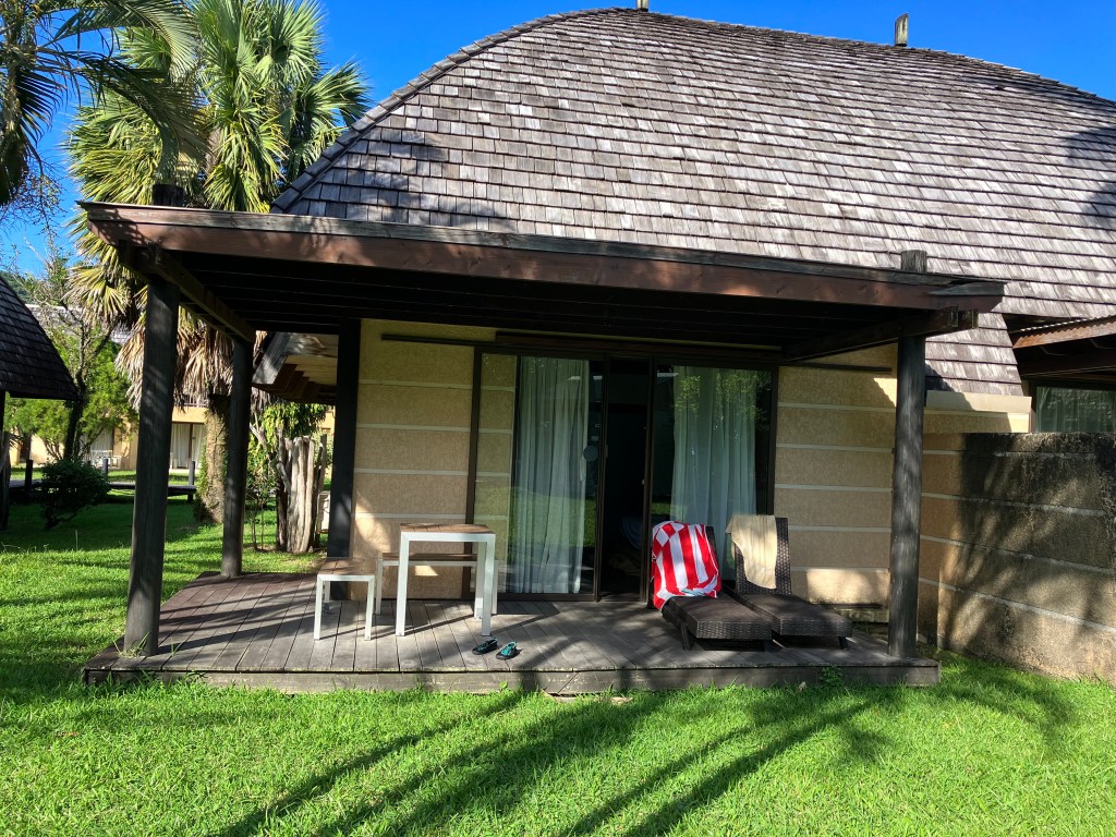 The bungalow was nice, air-conditioned with a fridge, tv (but no BBC here, only French channels), a good outdoor patio with sun loungers and a chair and table, and very big bathroom.